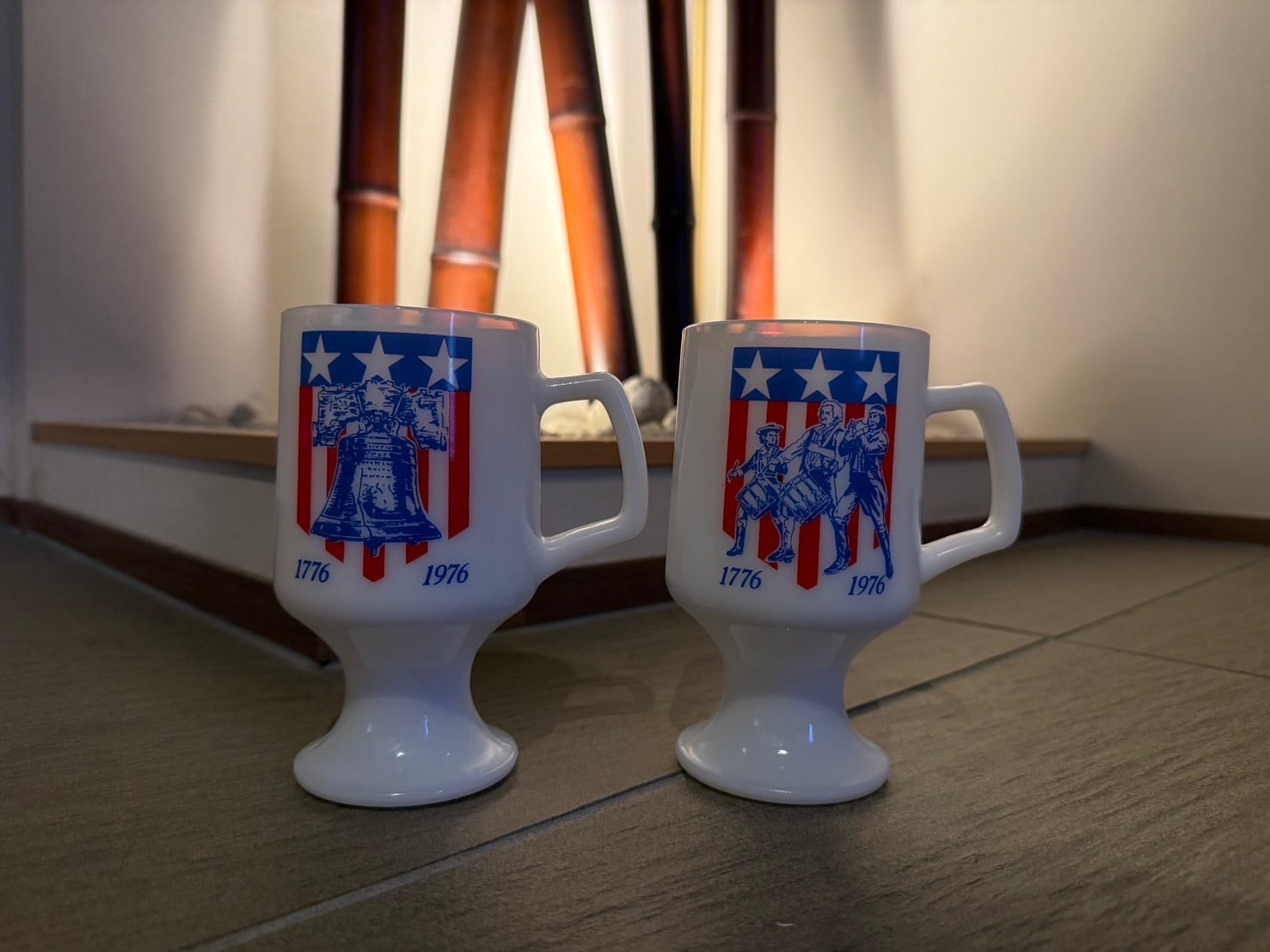 ミルクガラス ヴィンテージ 脚付きマグカップ(1776-1976柄/アメリカンパターン)